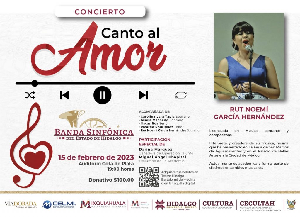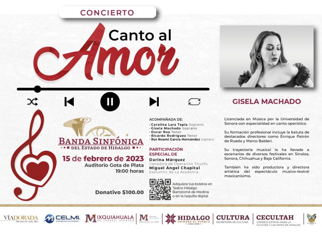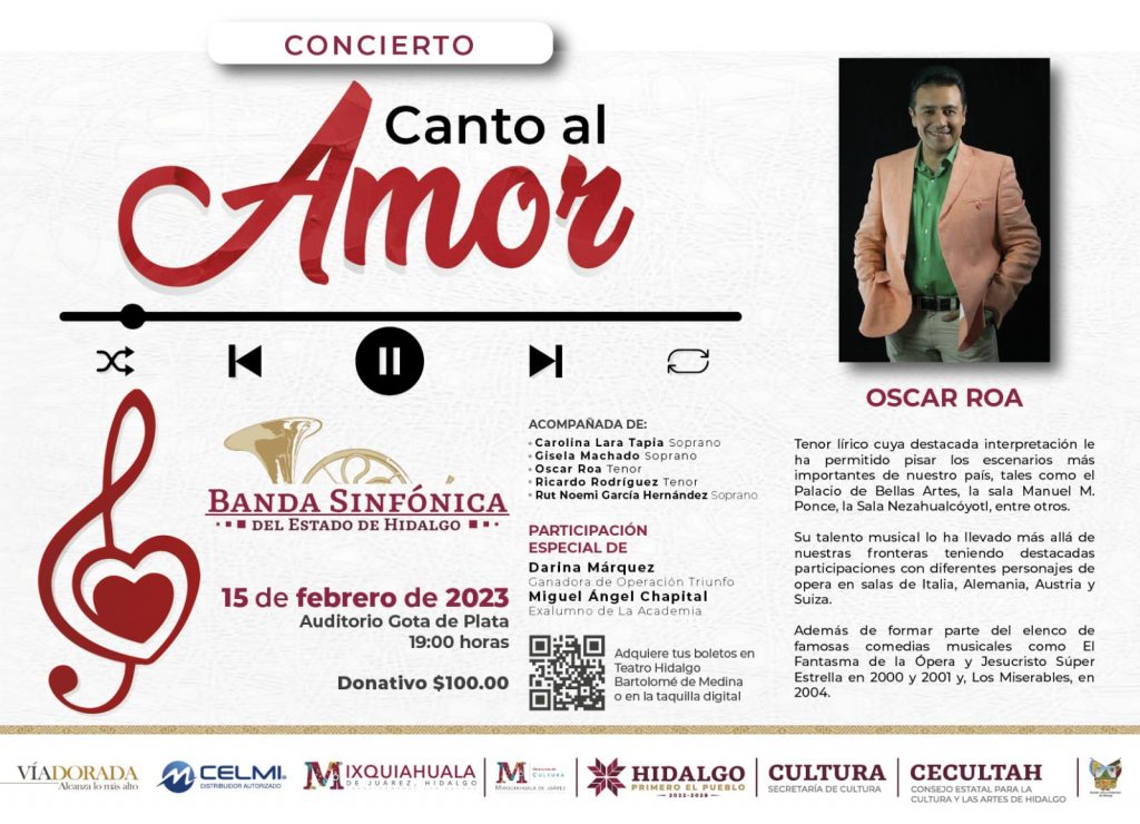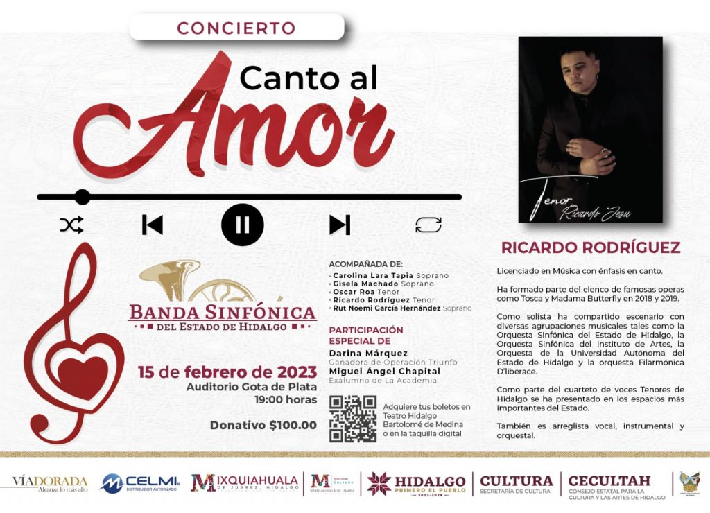 Pachuca, Hgo.- La Secretaría de Cultura, a través del Consejo Estatal para la Cultura y las Artes de Hidalgo (Cecultah), presentó el programa del concierto “Canto al amor”, que se llevará a cabo este miércoles 15 de febrero en el auditorio Gota de Plata, a las 19:00 horas, con la ejecución musical de la Banda Sinfónica del Estado.