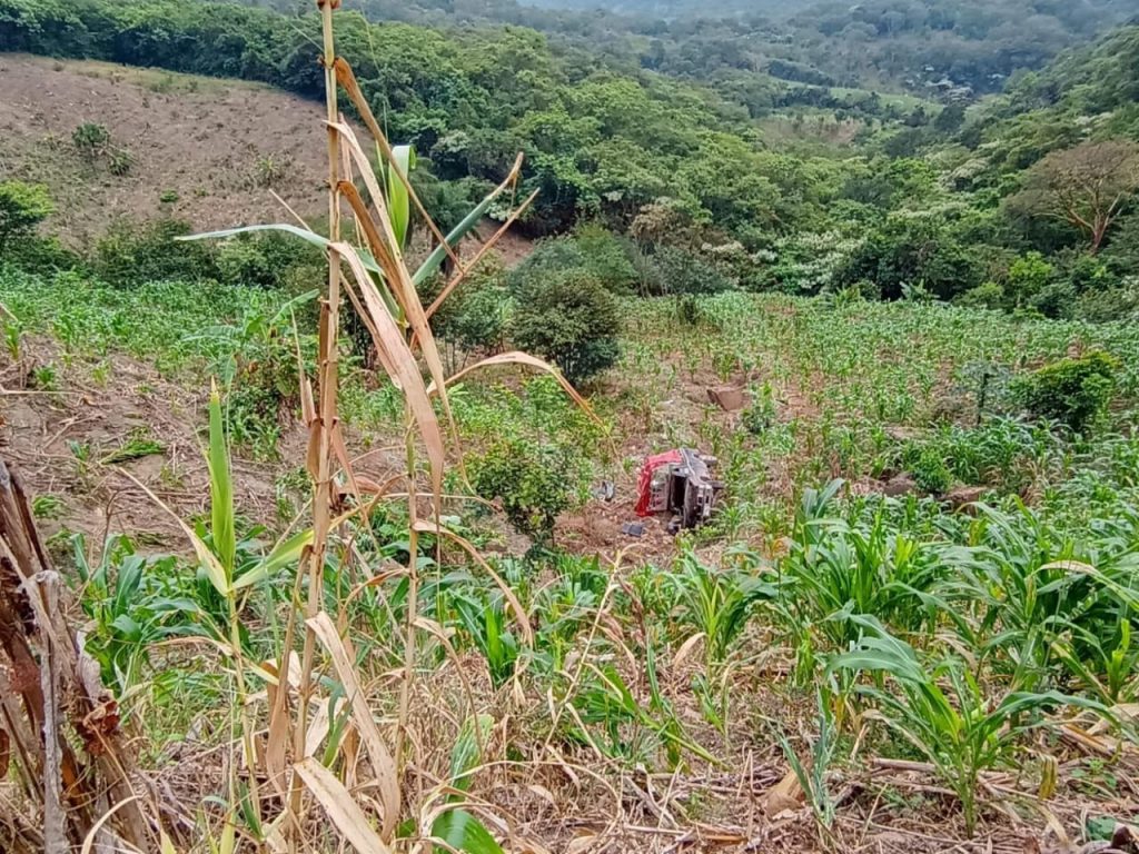 El accidente fue protagonizado por un vehículo de la marca Nissan, de color negro con gris y placas de circulación XF-9207-B del estado de Veracruz, el cual se salió de la cinta asfáltica, se fue al voladero y cayó a una milpa como 50 metros de distancia de la carretera.