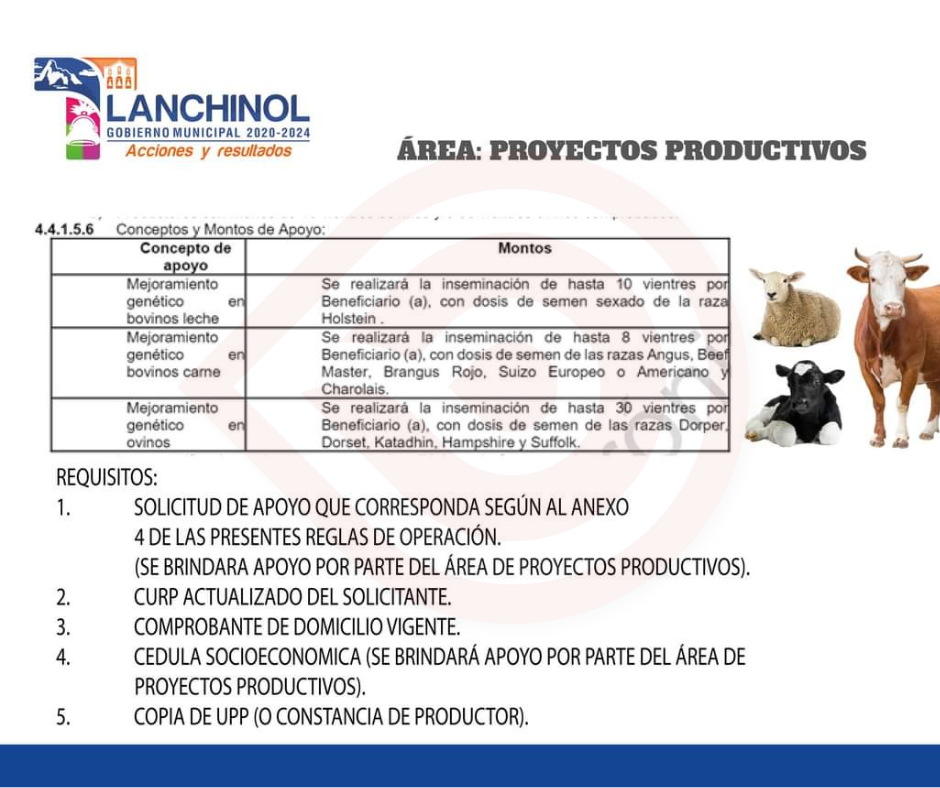 Podrán solicitar su apoyo en Mejoramiento Genético en Bovinos leche, Mejoramiento Genético en Bovinos Carne y Mejoramiento genético en Ovinos; Paquete Tecnológico Apícola; Paquete Tecnológico Cunícola y Material vegetativo para producción de limón.