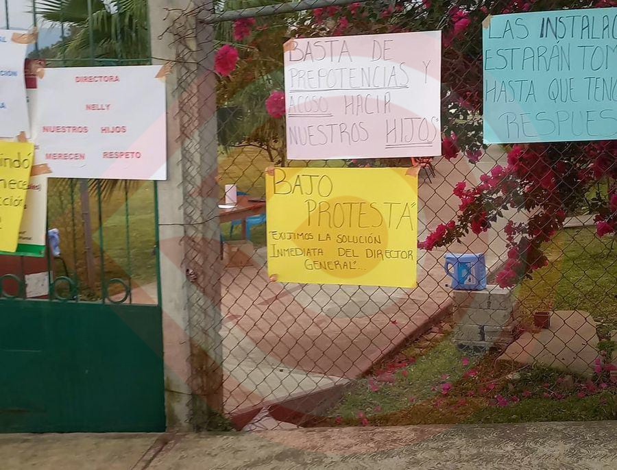 Los inconformes exigen la destitución de la maestra Nelly de Jesús Chapa Contreras, directora del plantel educativo y como medida de presión para solicitar la destitución de la docente, colocaron cartulinas en la entrada del plantel educativo.