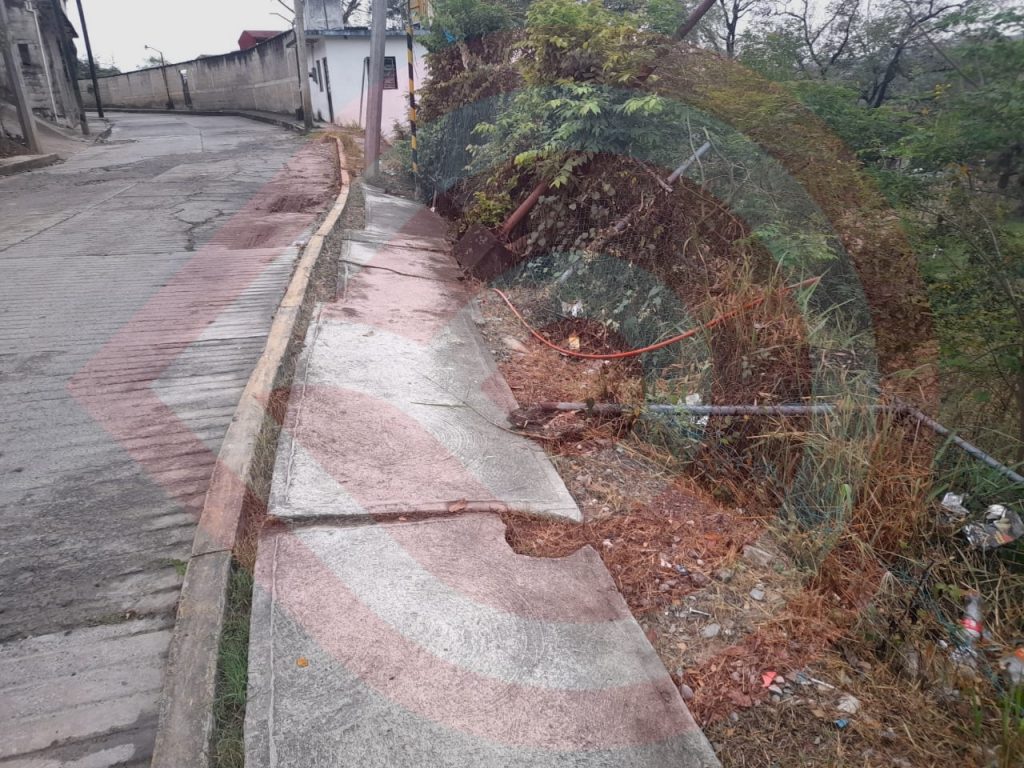 Huejutla, Hgo.- Habitantes de la colonia Rojo Gómez y de sectores poblacionales aledaños, manifestaron que aunque no es utilizada por su acentuado detrimento, no deja de ser un peligro latente para los transeúntes la banqueta despedazada que se encuentra en la calle El Mirador.