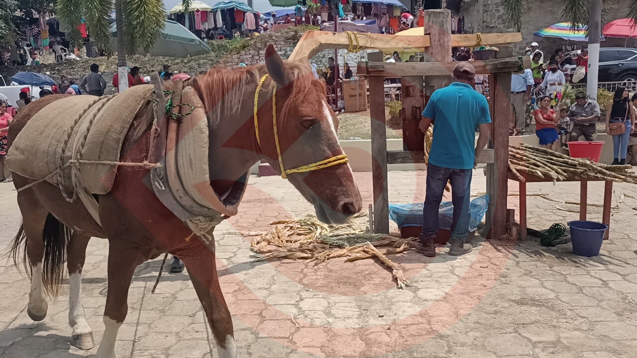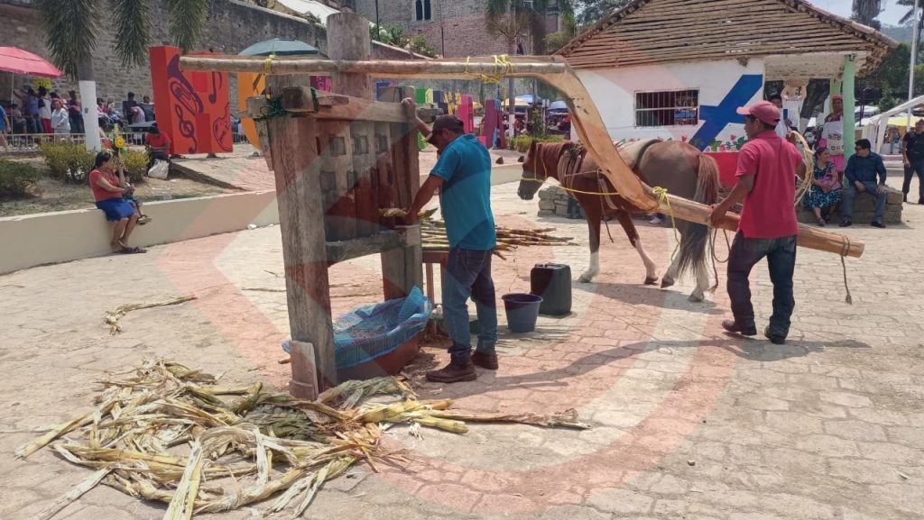 Habitantes de la comunidad de la Mesa de Limantitla instalaron en la plaza el tradicional trapiche, donde ayudados con la fuerza de un caballo y rodillos de madera, exprimieron las varas de caña, sacando el dulce jugo.