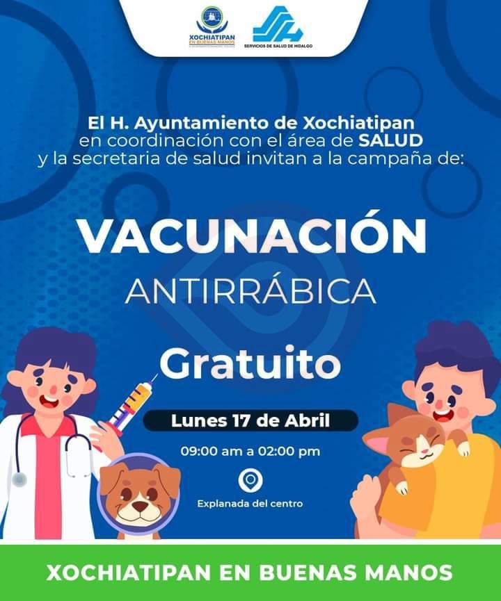 Xochiatipan, Hgo. – La administración municipal que preside Óscar Bautista Gutiérrez, a través del área de Salud, invita a la población en general a la Campaña de Esterilización y Vacunación Antirrábica para perros y gatos.