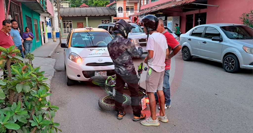 Huejutla, Hgo.- Dos motociclistas que circulaban a exceso de velocidad sobre la calle Constitución esquina con Yucatán, chocaron de frente con un automóvil de alquiler, incidente que dejó solo daños materiales mínimos.