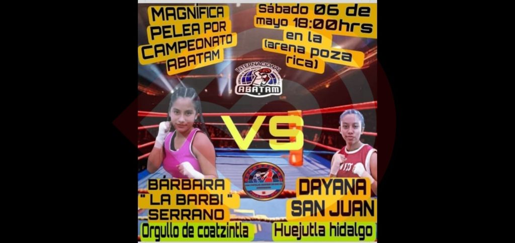 Huejutla, Hgo.- El sábado 6 de mayo del presente año se enfrentará Bárbara “Barbie” Serrano a Dayana “Yayis” Sanjuan en el campeonato ABATAM en la Monumental Arena de Poza Rica, Veracruz, a las 18:00 horas.