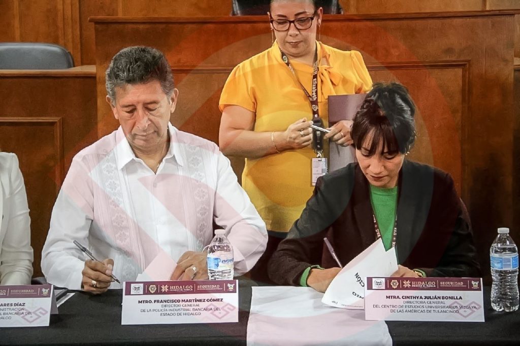Pachuca, Hgo.- Con la finalidad de fomentar la profesionalización de las mujeres y los hombres que laboran en la Policía Industrial Bancaria del Estado de Hidalgo, y por instrucciones del gobernador, Julio Menchaca Salazar, el titular de la PIBEH, Francisco Martínez Gómez, y Cinthya Julián Bonilla, directora general del Centro de Estudios Universitarios Vizcaya de las Américas, firmaron un convenio de colaboración.