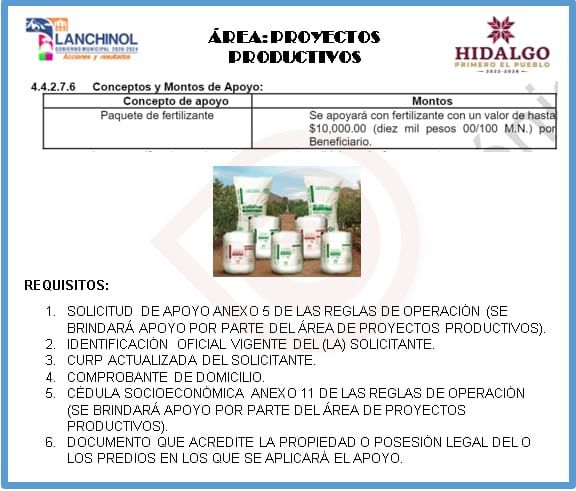 En esta última se estará recabando la documentación para los productores interesados en adquirir paquetes de fertilizantes, se apoyará con este insumo por hasta $10,000.00 pesos; paquetes de aves de postura, donde los beneficiarios podrán recibir hasta 20 aves; equipamiento para productores agrícolas, donde se tendrán beneficios de hasta $20,000.00 pesos; equipamiento para producción acuícola donde los productores podrán ser dotados con equipo de valor de hasta $35,000.00 pesos; equipamiento para la producción de café, donde se brindarán apoyos de hasta $20,000.00 pesos; así como equipamiento para el manejo zootécnico de ganado bovino, ovino y porcino con apoyos de hasta $20,000.00 pesos.