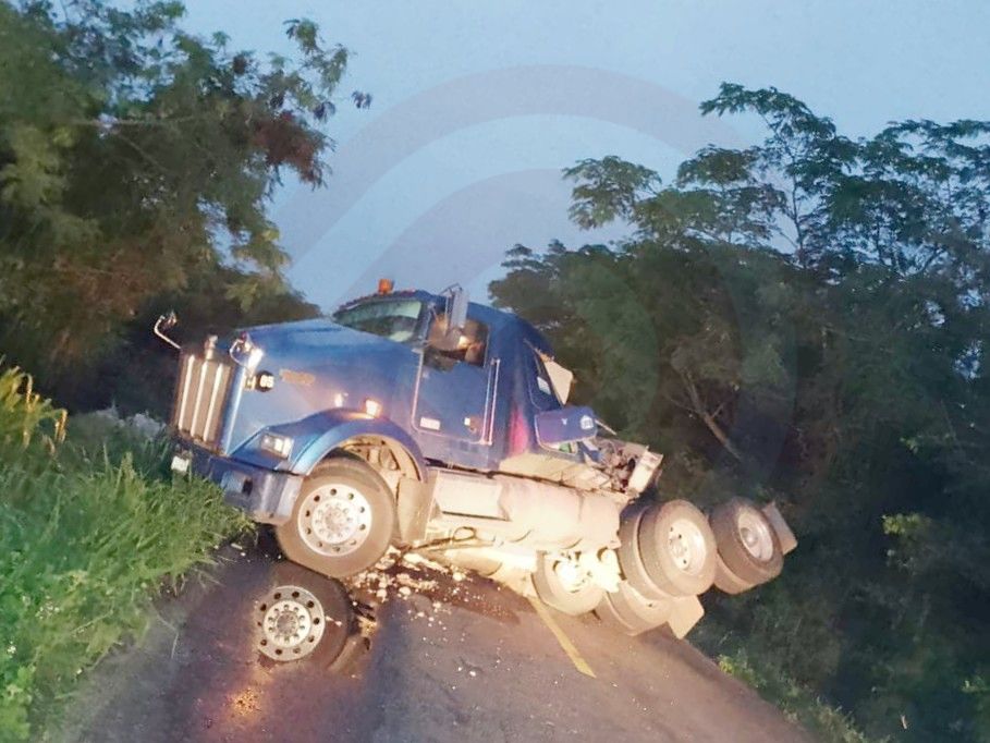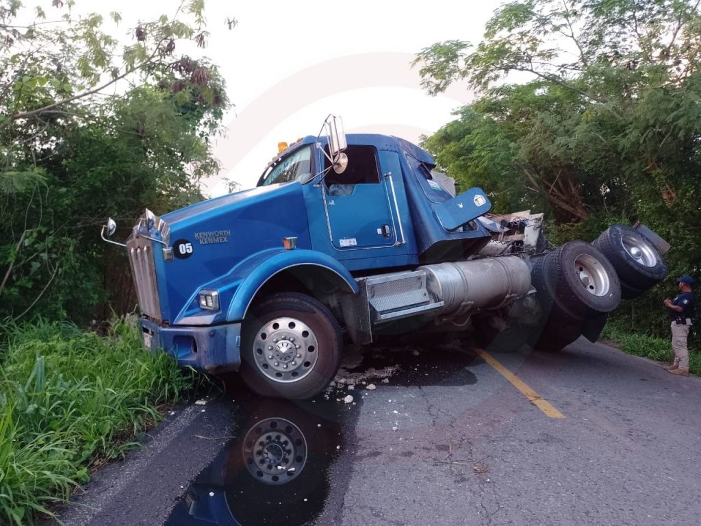 La pesada unidad transportaba material para la elaboración de cal y se dirigía a Ciudad Valles, San Luis Potosí, sin embargo, en el trayecto el operador perdió el control del volante y terminó recostado sobre la cinta asfáltica.