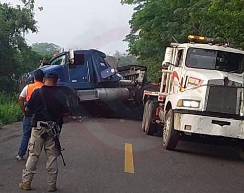 Platón Sánchez, Ver.- La volcadura de un tráiler que se registró la mañana de este martes, en la carretera federal México-Tampico, bloqueó totalmente el paso en esta importante vía de comunicación.