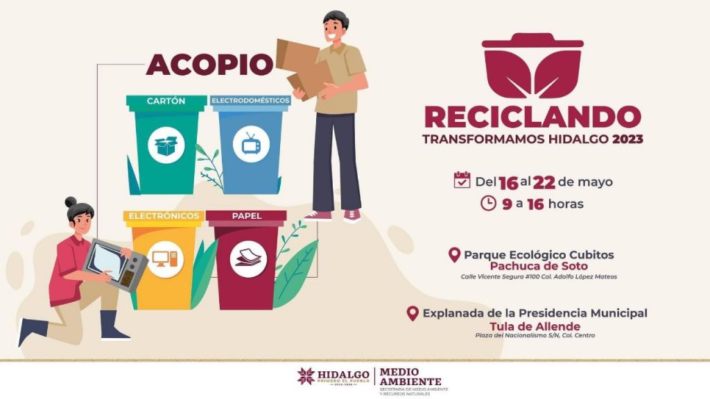 Por ello, se dio a conocer que las sedes donde se podrán depositar materiales para su reciclaje serán: el Parque Ecológico Cubitos en la calle Vicente Segura número 100, colonia Adolfo López Mateos en la ciudad de Pachuca; así como la explanada de la presidencia municipal de Tula de Allende, en un horario de 9:00 a 16:00 horas, de lunes a viernes.