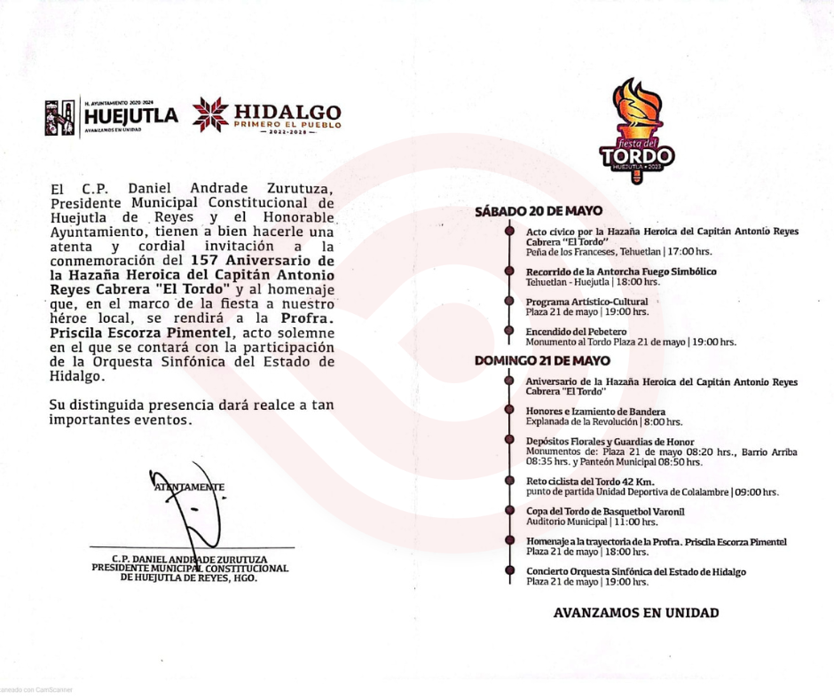 Huejutla, Hgo.- El Ayuntamiento que preside Daniel Andrade Zurutuza, conmemorará los próximos 20 y 21 de mayo (sábado y domingo), el 157 aniversario de la gesta heroica de Antonio Reyes Cabrera “El Tordo”, protagonizada el 21 de mayo de 1866.