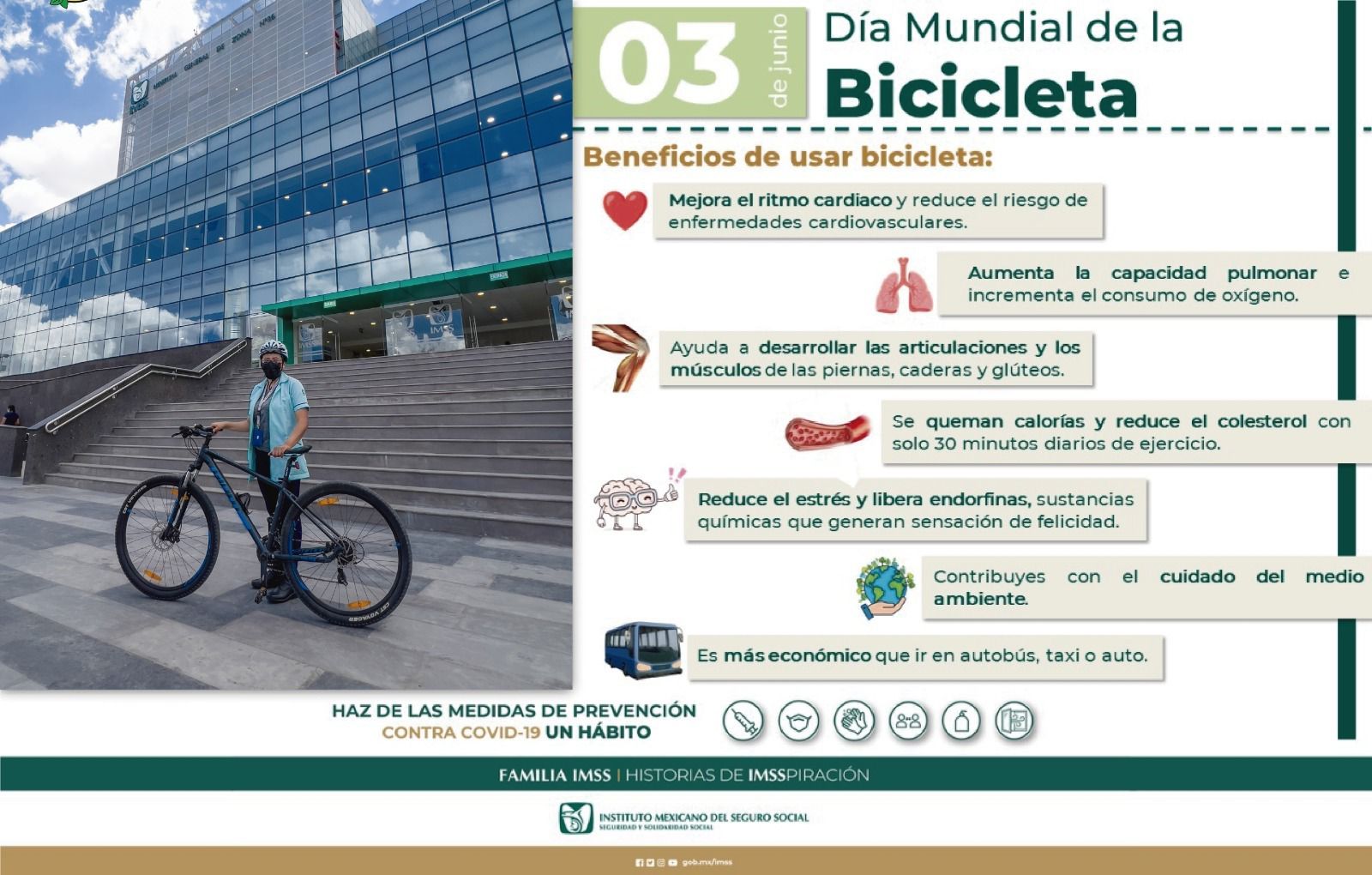 Pachuca, Hgo.- En el marco del Día Mundial de la Bicicleta, el Instituto Mexicano del Seguro Social (IMSS) en Hidalgo invita a sumarse a seguir un estilo de vida más saludable y sostenible promoviendo el uso de la bicicleta como una opción segura y saludable en todas las actividades de la vida diaria.