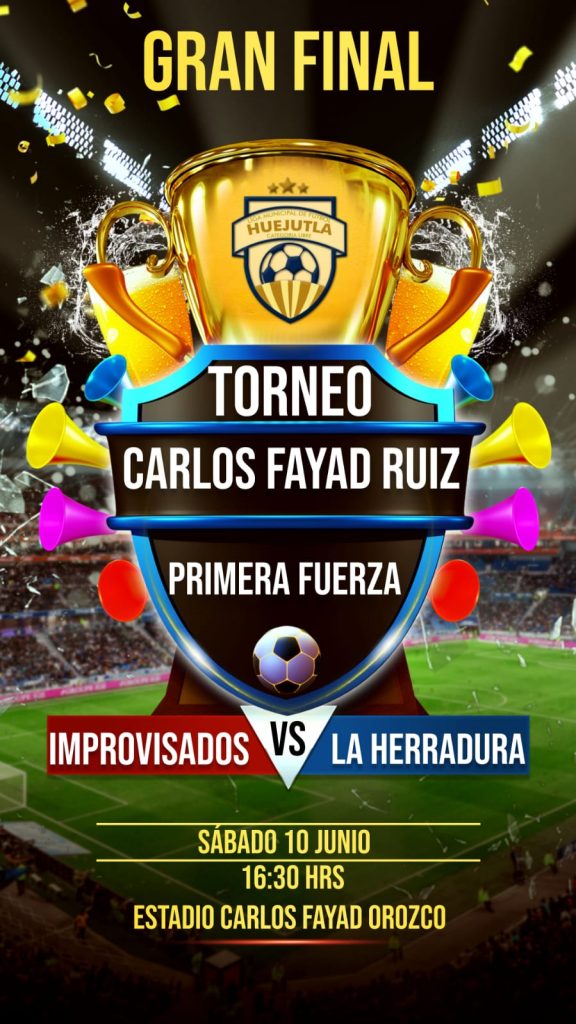 Huejutla, Hgo.- La Liga Municipal de Fútbol Categoría Libre (LMFCL) presentó la final de la primera fuerza del torneo de liga 2022-2023 denominado “Carlos Fayad Orozco”, el sábado 10 de junio del presente año, en el Estadio Municipal “Carlos Fayad Orozco”: a las 16:30 horas Improvisados vs. La Herradura.
