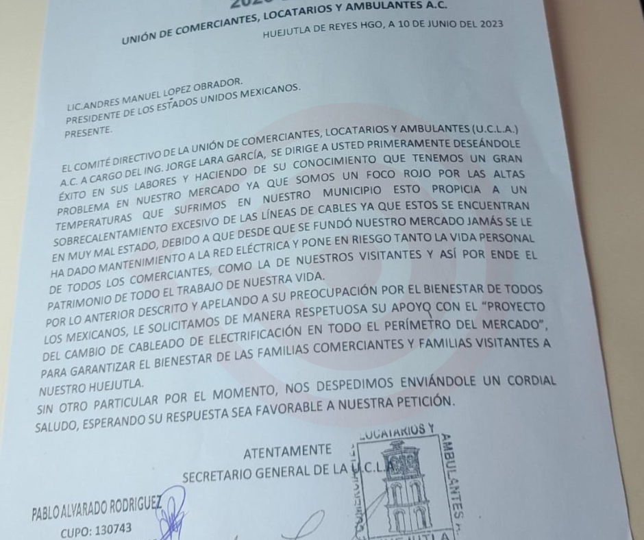 “Apelando a su preocupación por el bienestar de todos los mexicanos, le solicitamos de manera respetuosa su apoyo con el proyecto del cambio de cableado de electrificación en todo el perímetro del mercado, para garantizar el bienestar de las familias comerciantes y familias visitantes a nuestro Huejutla” señalan.