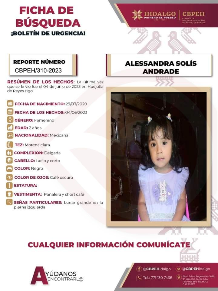 >>>La PGJEH inició una carpeta de investigación y emiten ficha de búsqueda. Por Francisco Rosas/Zunoticia Huejutla, Hgo.- Se solicita la colaboración de la población en general, para localizar a la menor Alessandra Solís Andrade, de tan solo 2 años de edad, quien al parecer fue sustraída por familiares del padre de la infante. De acuerdo… Seguir leyendo Raptan a menor de dos años