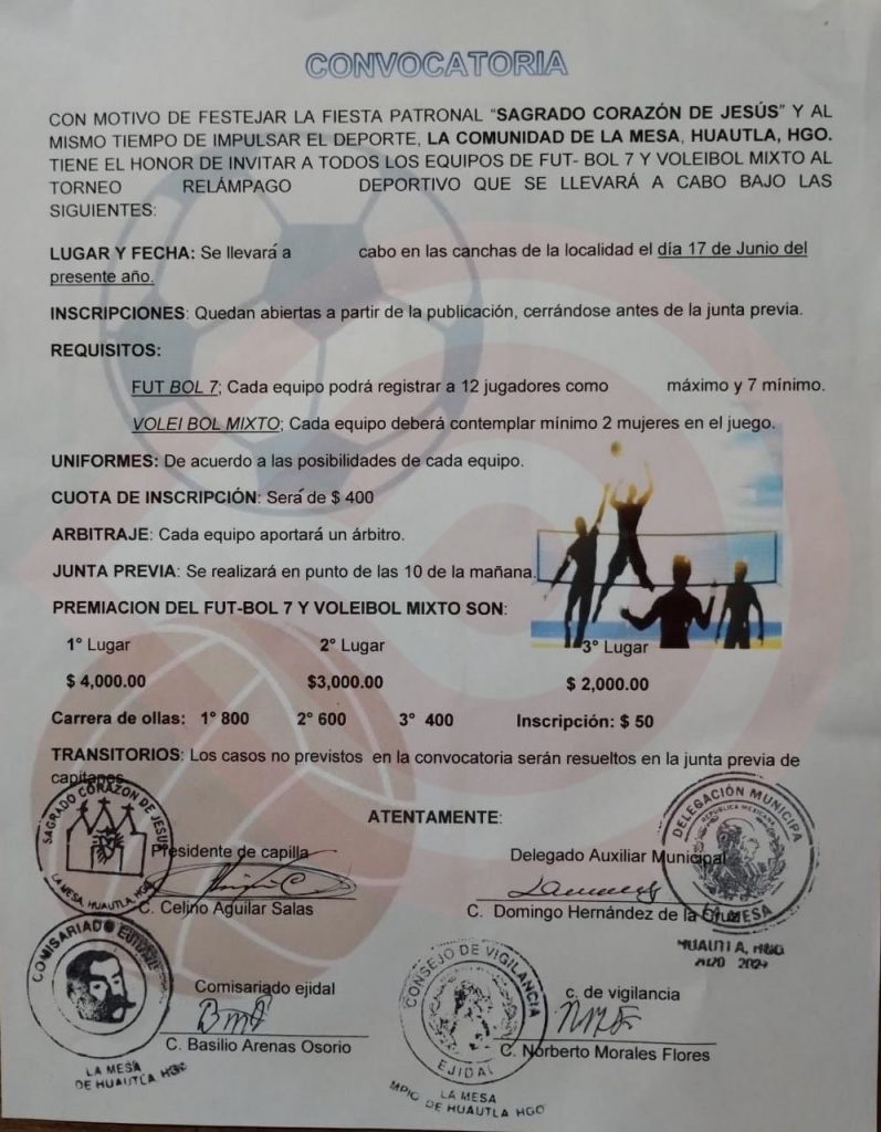 Huautla, Hgo.- El comité organizador de la fiesta patronal en honor al Sagrado Corazón de Jesús, a celebrarse en la comunidad de La Mesa de este municipio, invita a la población a los festejos que tendrán verificativo los días 16 y 17 del mes y año en curso.