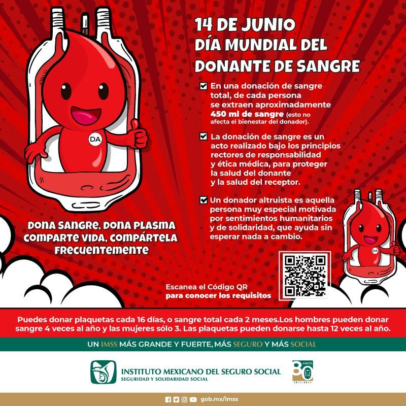 Pachuca, Hgo.- Bajo el lema “Dona sangre, dona plasma, comparte vida, compártela frecuentemente”, el Instituto Mexicano del Seguro Social (IMSS) en Hidalgo se une a la conmemoración del Día Mundial del Donante de Sangre, un acto altruista que salva vidas y que es esencial en la atención médica de emergencias, enfermedades crónicas y diversos procedimientos quirúrgicos.