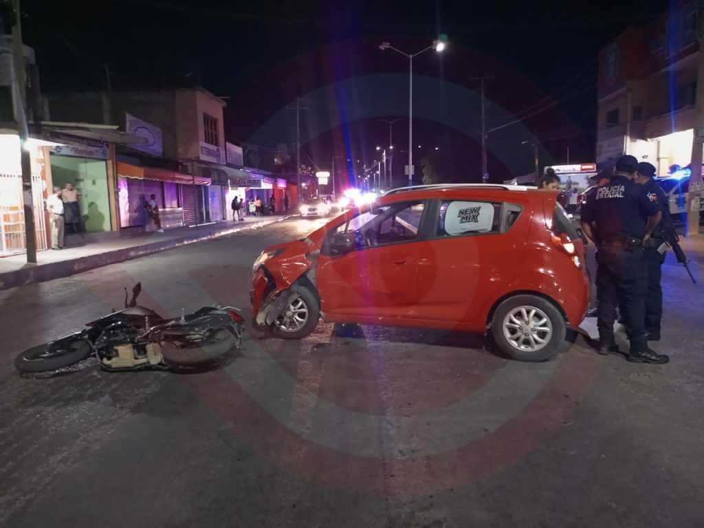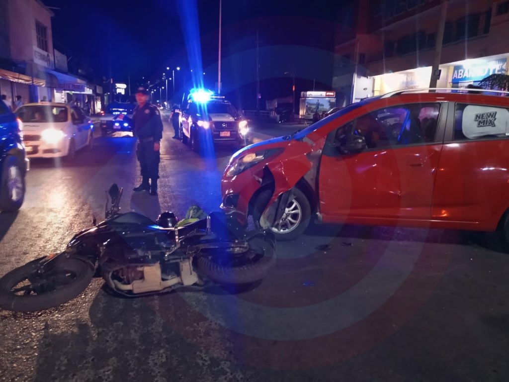 Huejutla, Hgo.- Un fuerte choque entre un auto compacto y una motocicleta, dejó como saldo dos personas lesionadas y daños materiales por varios miles de pesos.