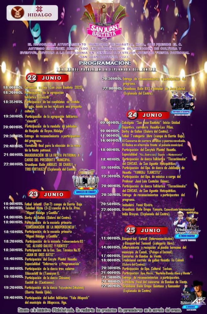 El evento dará arranque con la coronación de la reina “San Juan Bautista 2023”, después de culminar este evento, alrededor de las 9:00 de la noche, dará inicio la inauguración oficial y el corte de listón por parte del presidente municipal, Artemio Martínez Rebolledo y comitiva.