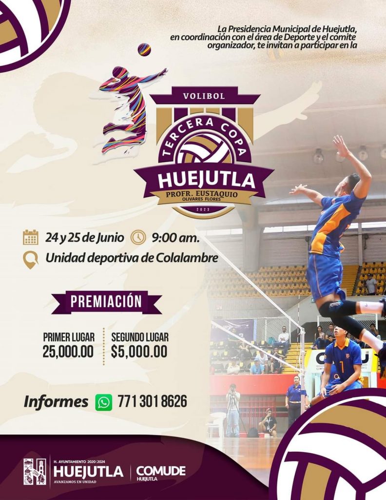Huejutla, Hgo.- El sábado 24 y domingo 25 de junio del presente año se celebrará la Tercera Copa de voleibol varonil en la unidad deportiva “Colalambre” de esta cabecera municipal.