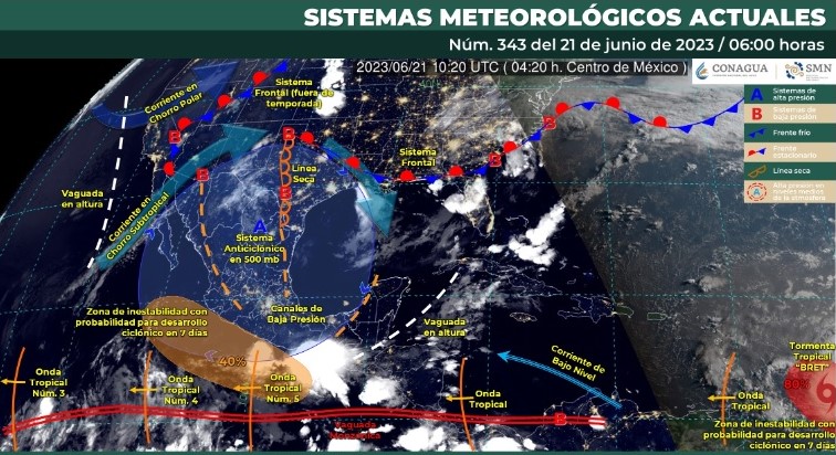 Este miércoles, el desplazamiento de la Onda Tropical Número 5 por el sur de Guerrero y canales de baja presión sobre el noroeste, oriente y sureste de México podrían ocasionar lluvias intensas (de 75 a 150 milímetros [mm]) en Chiapas; muy fuertes (de 50 a 75 mm) en Oaxaca; fuertes (de 25 a 50 mm)… Seguir leyendo Se prevé que la tercera onda de calor mantenga el ambiente de caluroso a muy caluroso en la República Mexicana
