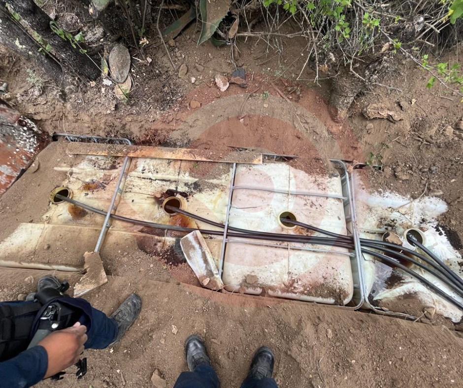 En el primero se localizaron cuatro contenedores enterrados, con un aproximado de mil 500 litros de combustible; mientras que metros más adelante, sobre un barranco, fueron encontrados cuatro tambos abastecidos con 700 litros de hidrocarburo.