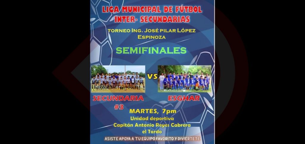 Huejutla, Hgo.- El martes 11 de julio del presente año se efectuará la 1era semifinal de la Liga Municipal de Fútbol Varonil Inter Secundarias (LMFVIS), a las 19:00 horas en la Unidad Deportiva “El Tordo”: Secundaria 3 vs. ESGHAR.