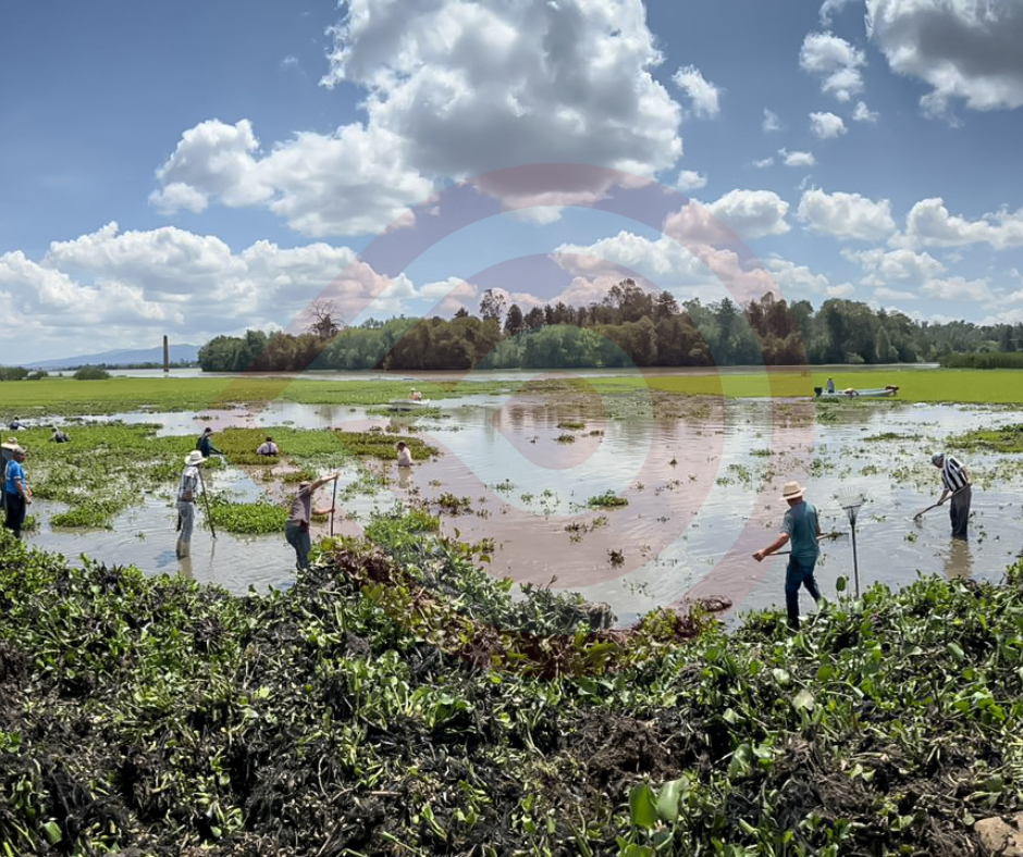 De igual forma, a través del uso de bieldos, los ejidatarios participantes llevan a cabo el retiro manual de la maleza y mediante la técnica de acamellonamiento del lirio acuático, éste se deshidrata con mayor velocidad mediante el apoyo de máquinas retroexcavadoras.