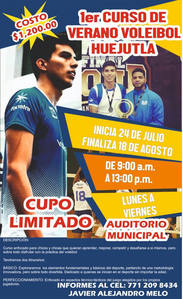 Huejutla, Hgo.-  El jugador profesional y seleccionado nacional de voleibol Alejandro Melo Mares invita a los amantes del voleibol a participar al 1er curso de verano de Voleibol del 24 de julio al 18 de agosto del presente año.