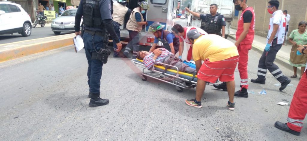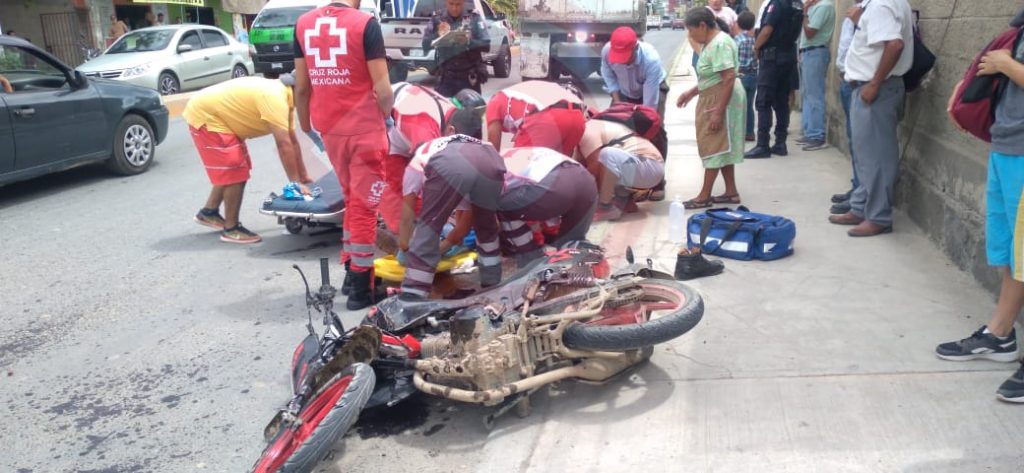 Huejutla, Hgo.- Un choque entre un camión de volteo y una motocicleta dejó una persona gravemente herida y con la pierna destrozada; los hechos se registraron sobre el bulevar central a la altura del M.P., en la colonia Olímpica. Al lugar arribaron paramédicos de los Bomberos y Cruz Roja Mexicana para encamillar al lesionado y trasladarlo a un hospital ISSSTE; el chófer del camión fue asegurado por la Policía Municipal.