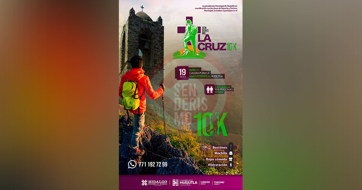 Huejutla, Hgo.- La presidencia municipal en coordinación con el área deportiva, y de turismo municipal invita a participar en un evento denominado “Senderismo La Cruz 10K”, el 19 de agosto de 2023, a las 8:00 horas saliendo de la galera pública de la comunidad de Macuxtepetla, Hidalgo y recorrerán 10 kilómetros.