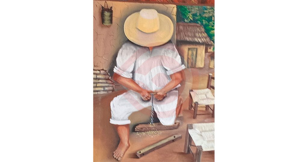 Explicó que el personaje que se observa en la obra, es su padre, Faustino Hernández, de 87 años de edad, quien siempre procuró el vital sustento de su familia fabricando sillas cuyo asiento es tejido con palma, así como petates, sombreros y abanicos para avivar la lumbre del fogón.