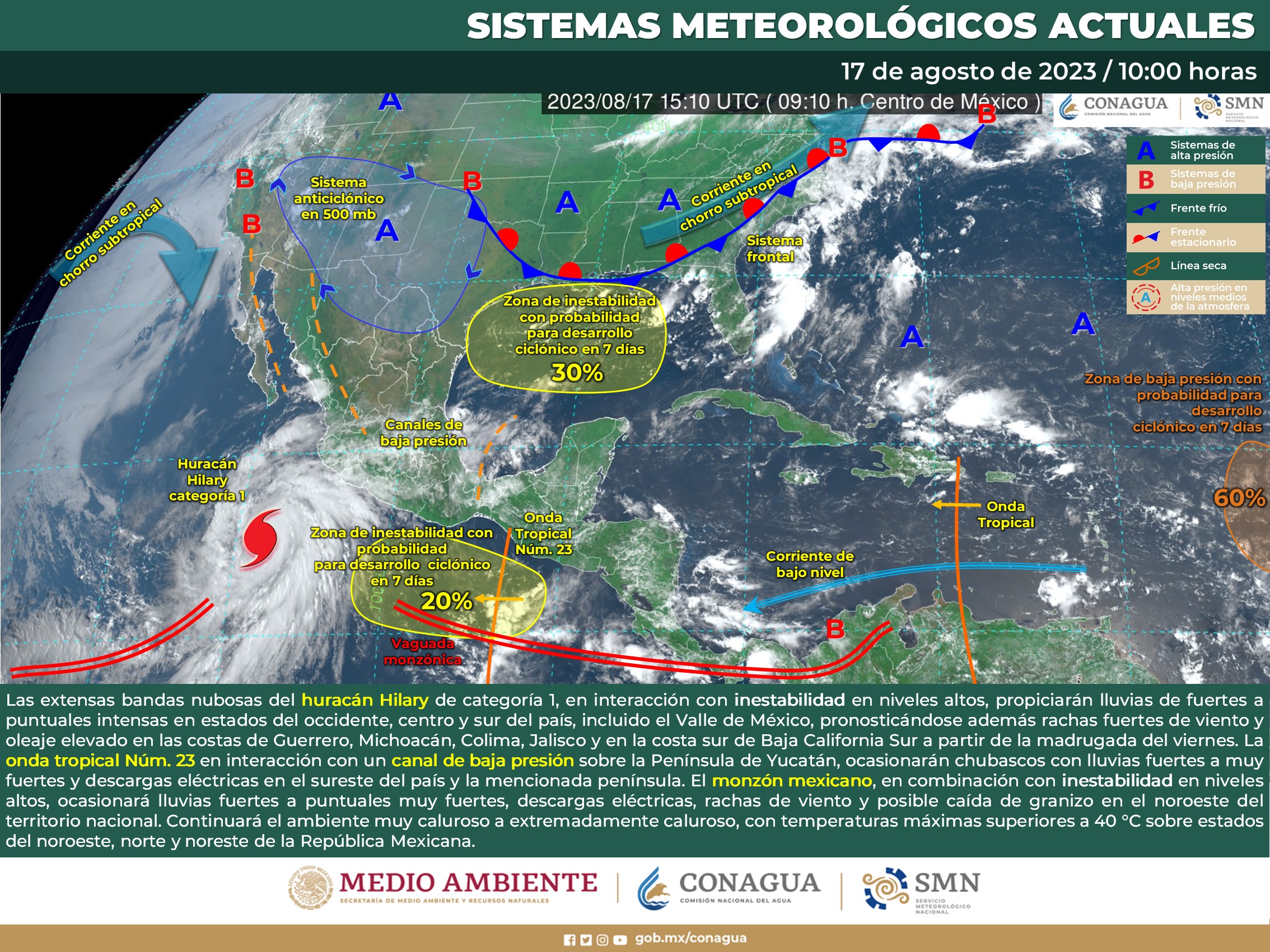 Por otra parte, el monzón mexicano, inestabilidad atmosférica superior y un canal de baja presión sobre el sur del Golfo de México originarán lluvias muy fuertes en Chiapas, Sonora y Veracruz; fuertes (de 25 a 50 mm) en Chihuahua, Ciudad de México, Durango, Estado de México, Guanajuato, Hidalgo, Morelos, Puebla, Querétaro, Sinaloa, Tabasco, Tlaxcala y Zacatecas; chubascos (de 5 a 25 mm) en Aguascalientes, Baja California Sur, Campeche, Coahuila, Nuevo León, Quintana Roo, San Luis Potosí, Tamaulipas y Yucatán, así como lluvias aisladas (de 0.1 a 5 mm) Baja California.
