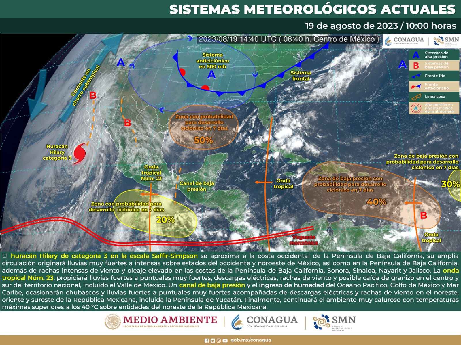 Esta mañana, Hilary ahora es huracán categoría 3 en la escala Saffir-Simpson; sus extensas bandas nubosas cubren la Península de Baja California y el noroeste de México, por lo que ocasionarán lluvias intensas (de 75 a 150 milímetros [mm]) en zonas de Baja California, Baja California Sur, costa norte de Sinaloa y costas de Sonora; muy fuertes (de 50 a 75 mm) en regiones de Aguascalientes, Guanajuato, Jalisco, Nayarit y Zacatecas, y fuertes (de 25 a 50 mm) en localidades de Chihuahua y Durango.
