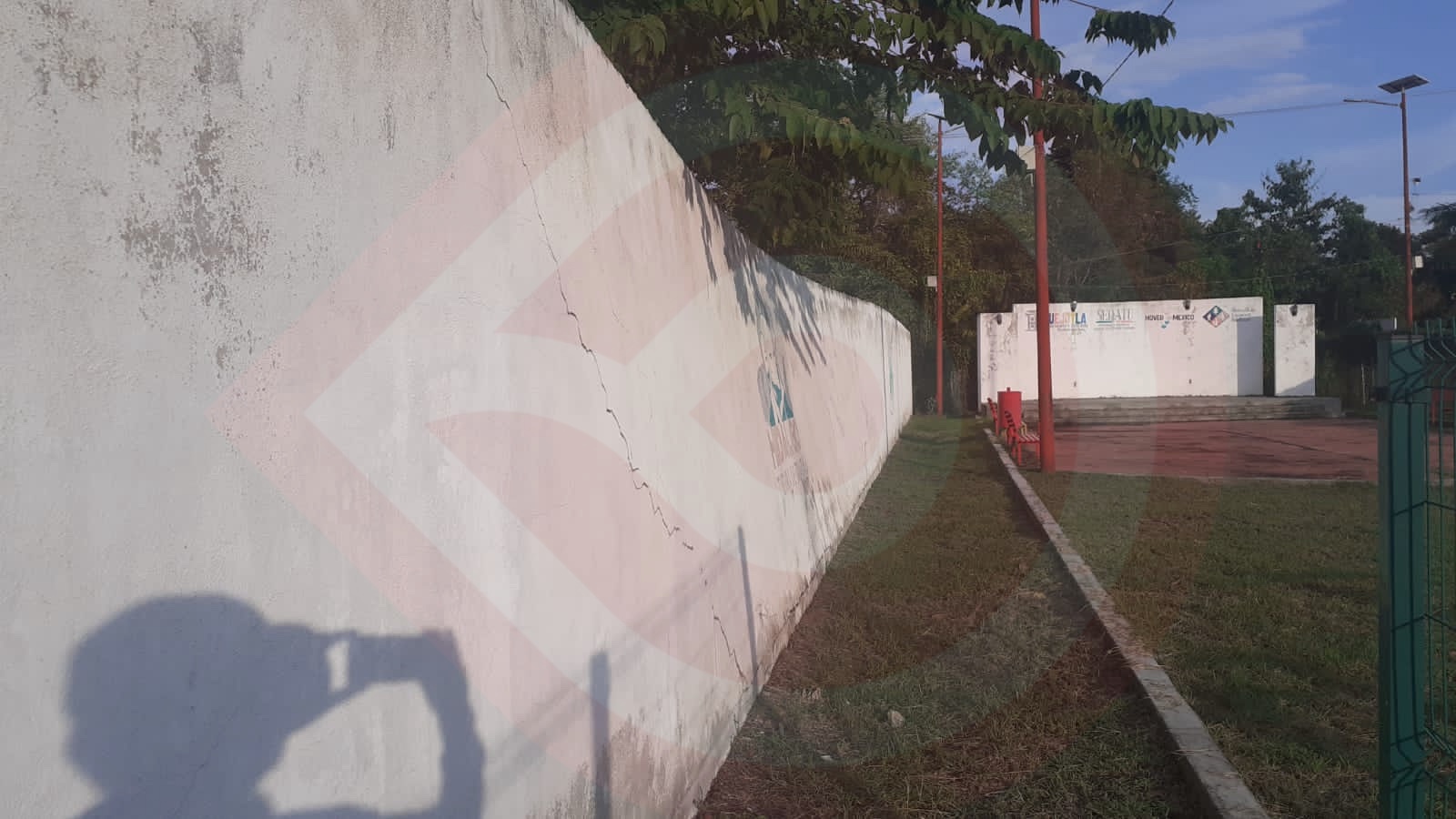 La barda perimetral está construida con material de construcción (Block, cemento, arena, varillas), está a punto de colapsar, y pudiera ocasionar un accidente, ya que el andador esta ubicado a un costado de dicha barda, y además; el lugar no a sido acordonado.