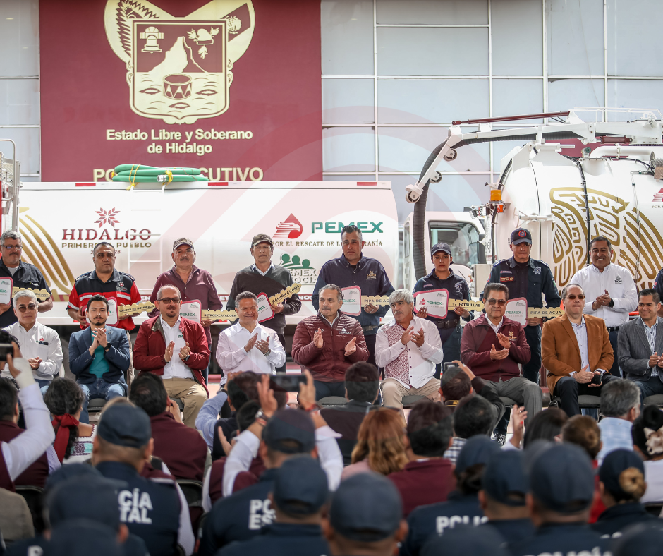 Bajo ese tenor, informó que Pemex entregó al estado de Hidalgo: 17 patrullas, retroexcavadoras, 2 pipas de 10 mil litros, 2 pipas de 20 mil litros, 2 camiones tipo chasis, camiones de bomberos, vehículos Roll Off de cable y 1 Bulldozer oruga.