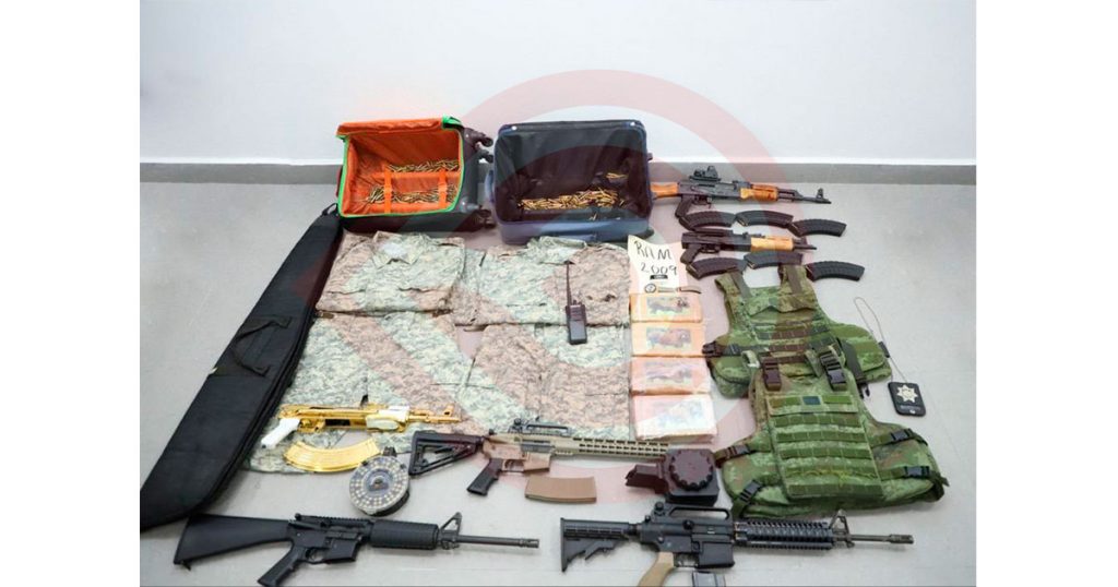 También se decomisaron: mil 363 cartuchos de arma de fuego de diferente calibres; 36 cargadores de arma larga; 4 mil 581 gramos de droga, con características de la cocaína; seis chalecos tácticos (dos de ellos tipo militar); cuatro camisolas militares; dos pantalones militares; tres radios de comunicación tipo PTT; una perforadora manual de ductos; dos maletas; una funda para arma de fuego y un porta credencial de policía, aparentemente apócrifo.