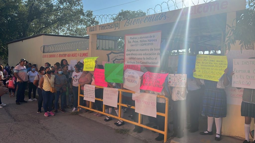 Huejutla, Hgo.- Por la falta de un maestro de base en la institución, padres de familia de la Escuela Primaria Niños Héroes de la colonia Valle del Encinal en esta ciudad de Huejutla de Reyes se manifiestan en las instalaciones del plantel educativo.