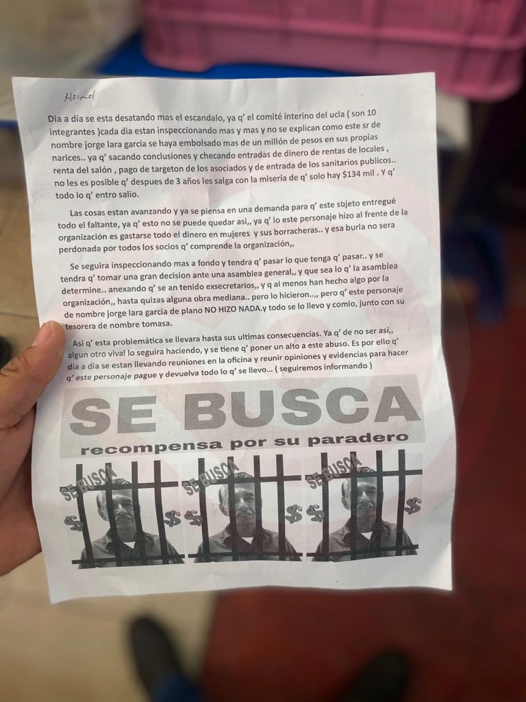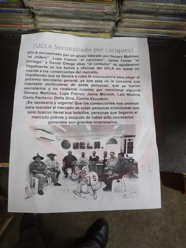 Exhibiendo sus nombres (se agrega en el volante), que, “es necesario y urgente que los comerciantes nos unamos para rescatar al Mercado de estas personas ambiciosas que solo buscan llenar sus bolsillos, quienes llegaron al Mercado Municipal pobres, y después de haber sido secretarios de la UCLA hoy son grandes empresarios”.