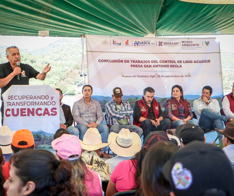 Pachuca de Soto, Hgo.- Como parte de la estrategia “Recuperando y Transformando Cuencas”, se llevó a cabo la clausura de trabajos de control de lirio acuático en la presa San Antonio Regla, encabezada por la Secretaría de Medio Ambiente y Recursos Naturales de Hidalgo (Semarnath), en coordinación con los usuarios de la unidad de riego San Antonio, el ayuntamiento municipal de Huasca de Ocampo, el hotel Santa María Regla y el centro turístico Prismas Basálticos.