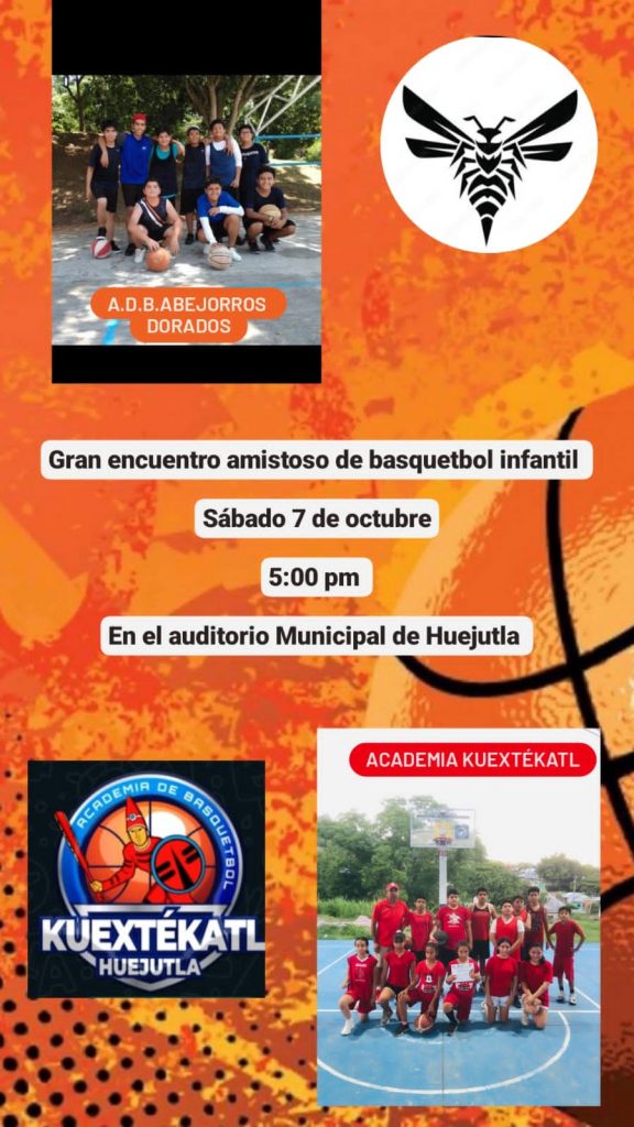 Huejutla, Hgo.- Alumnos de la Escuela Municipal de Básquetbol de Huejutla denominado “Kuextekatl” será el anfitrión de Abejorros de Tantoyuca, Veracruz, el sábado 7 de octubre del presente año, en el auditorio municipal de esta ciudad a las 17:00 horas.