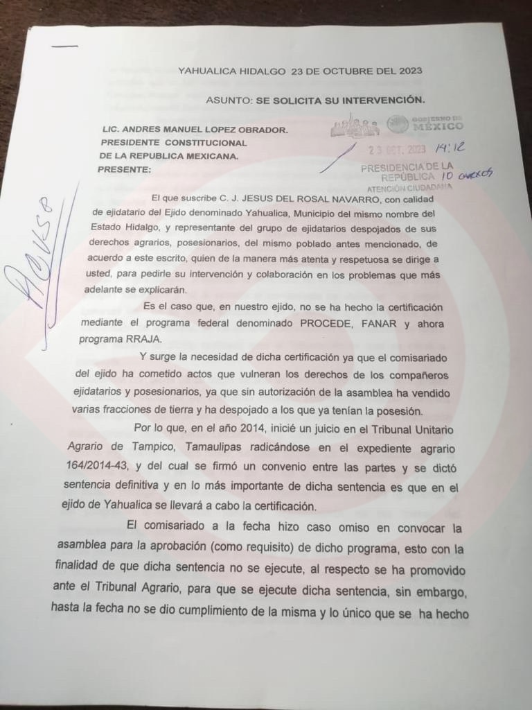 Ciudad de México.- Una denuncia fue recibida en Presidencia de la República dirigida a Andrés Manuel López Obrador, Presidente de México, el pasado 23 de Octubre a las 14:12 presentada por el ejidatario J. Jesús del Rosal Navarro del ejido denominado Yahualica, en el Estado de Hidalgo, y representante del grupo de ejidatarios despojados de sus derechos agrarios y en cuyo escrito denuncian a los funcionarios de la Procuraduría Agraria (visitadores, abogados, magistrados y residentes agrarios) de estar corrompidos y coludidos con el comisariado para mentir y afectar a los ejidatarios.