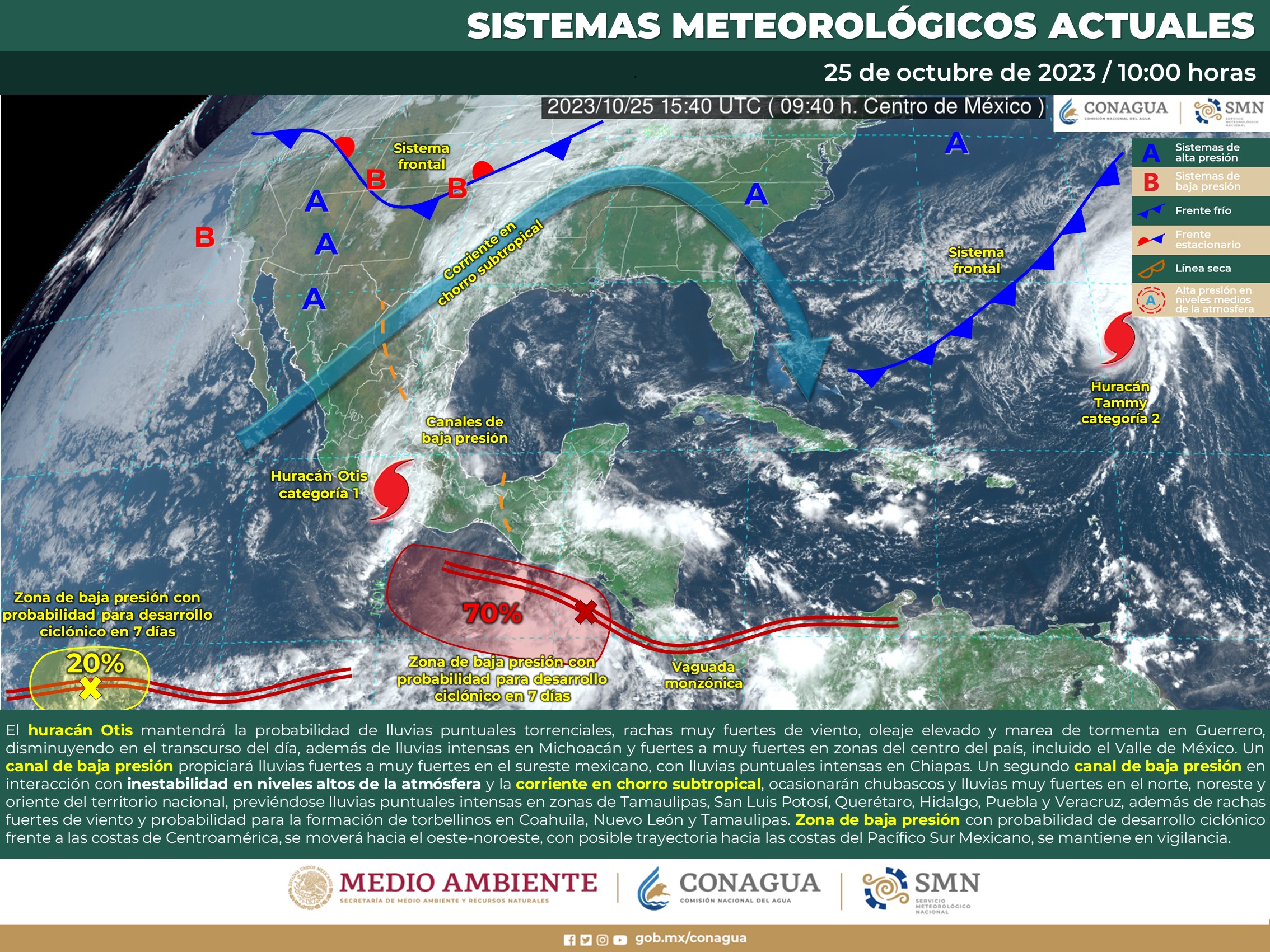 Su amplia circulación mantiene condiciones para lluvias torrenciales (de 150 a 250 milímetros [mm]) en Guerrero; intensas (de 75 a 150 mm) en Puebla y el oriente de Michoacán; muy fuertes (de 50 a 75 mm) en Morelos, el suroeste del Estado de México y el occidente de Oaxaca; fuertes (de 25 a 50 mm) en Ciudad de México, así como de fuertes a puntuales intensas en estados de la Mesa Central.