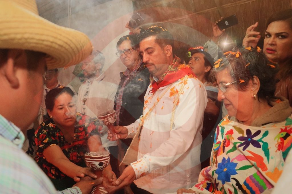 Acompañado del subsecretario de gobierno, Marco Antonio Ramos Moguel; del alcalde de Yahualica, Senón Navarro Morales; de funcionarios de primer nivel, con quienes, al final, recorrió cada espacio; con música de viento, olor a copal y pétalos naranja, todo encaminado al altar para ofrendar.