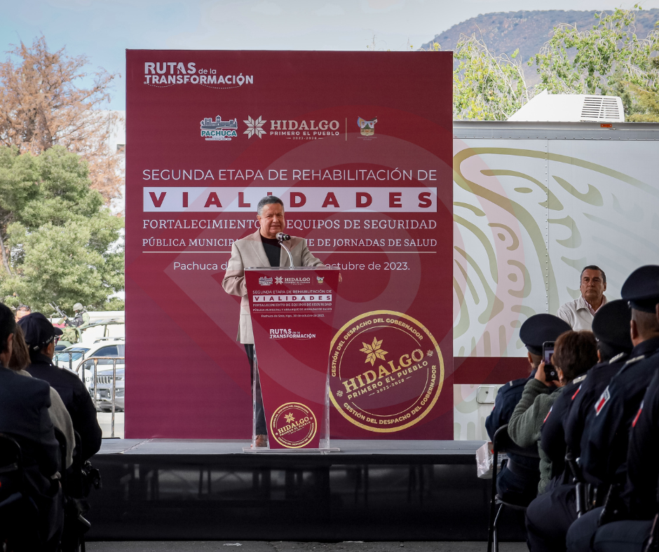 El mandatario estatal igualmente entregó patrullas y uniformes a elementos de la Secretaría de Seguridad Pública, Tránsito y Vialidad de Pachuca.