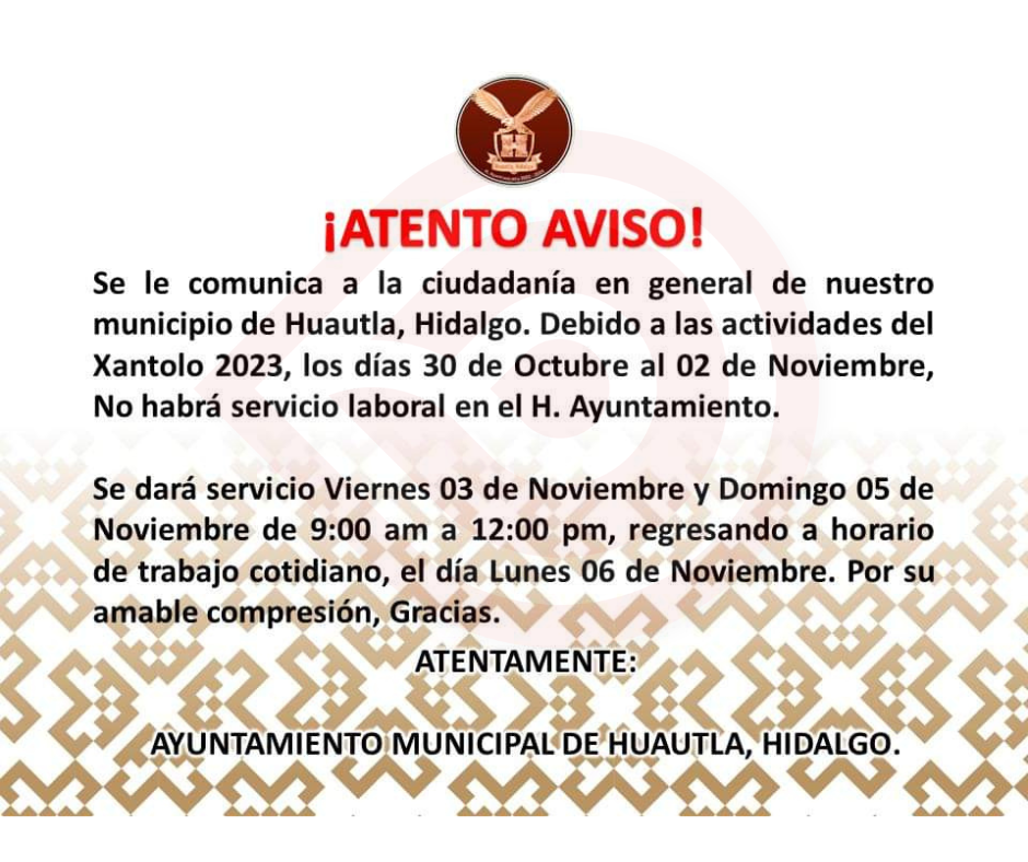 A través de un comunicado se dio aviso a la población que, del 30 de octubre al 2 de noviembre, por las actividades del Xantolo, se vieron irrumpidas las labores y trámites en la comuna municipal, por lo que pidieron la comprensión de la ciudadanía.