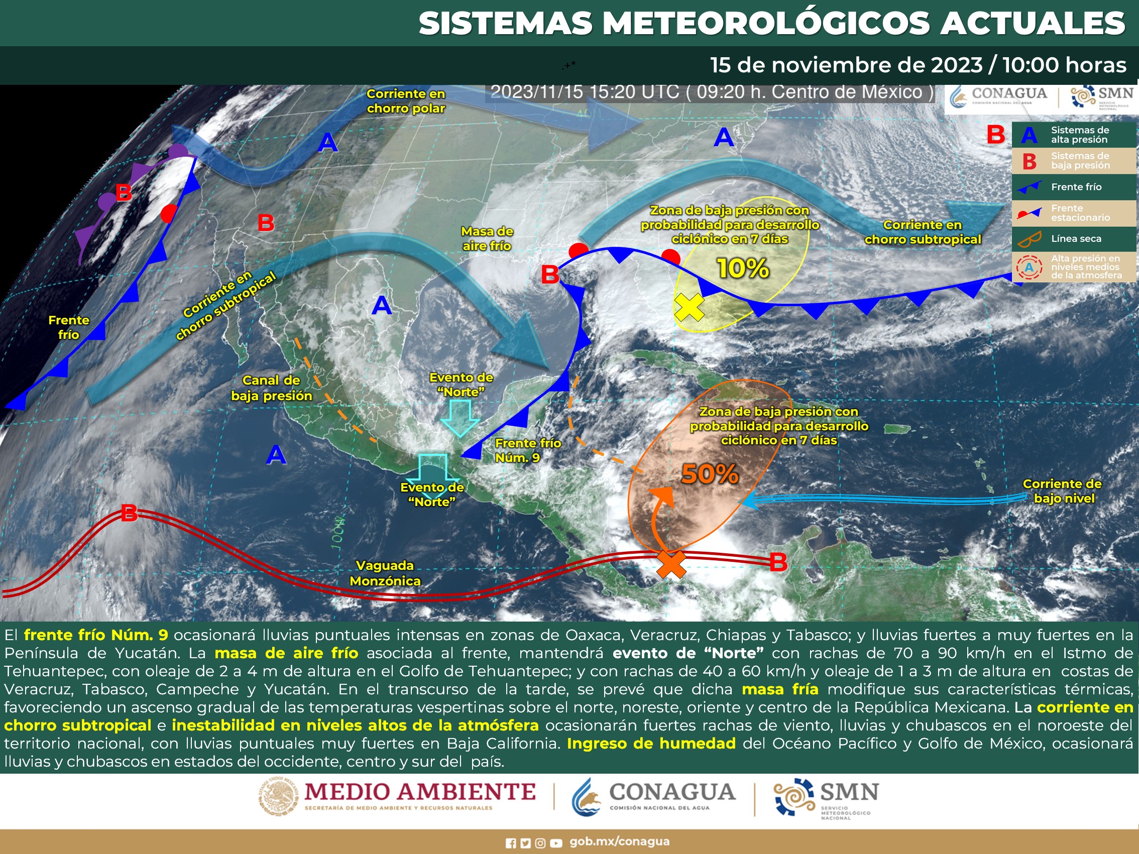 El frente frío número 9, que se desplazará sobre el sureste de la República Mexicana y la Península de Yucatán, la masa de aire frío asociada, la corriente en chorro subtropical, inestabilidad en niveles altos de la atmósfera, un canal de baja presión y el ingreso de humedad proveniente de los océanos, son los sistemas meteorológicos que originarán las condiciones descritas.