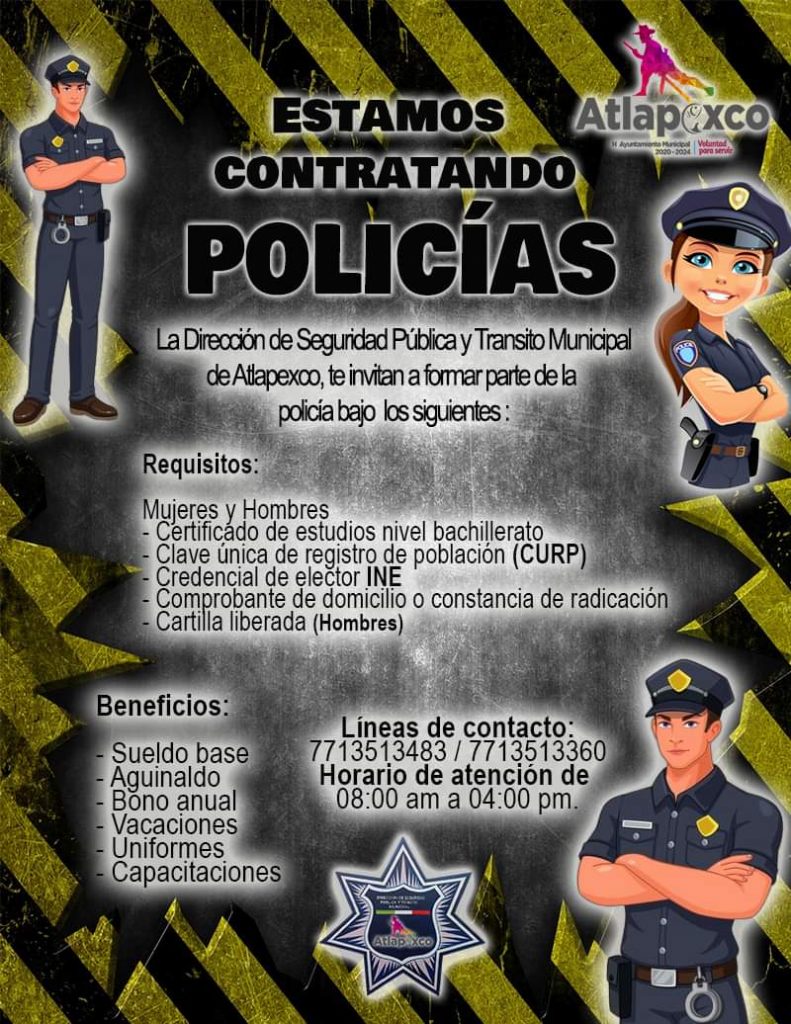 Atlapexco, Hgo.- A fin de formar parte del cuerpo policial, la Dirección de Seguridad Pública y Tránsito Municipal está llevando a cabo el reclutamiento de personal masculino y femenino.