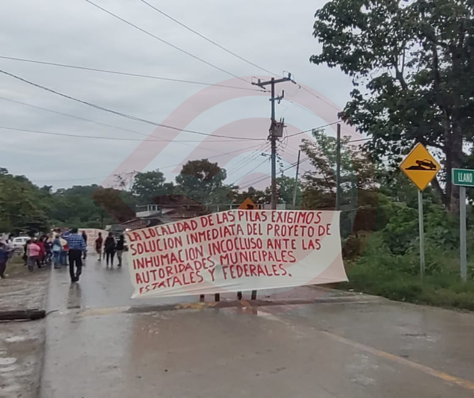 Chalma, Ver.– Como medida de presión para exigir la solución inmediata del proyecto del panteón inconcluso, vecinos de la localidad de Las Pilas, la mañana de este martes bloquearon la carretera federal México-Tampico.