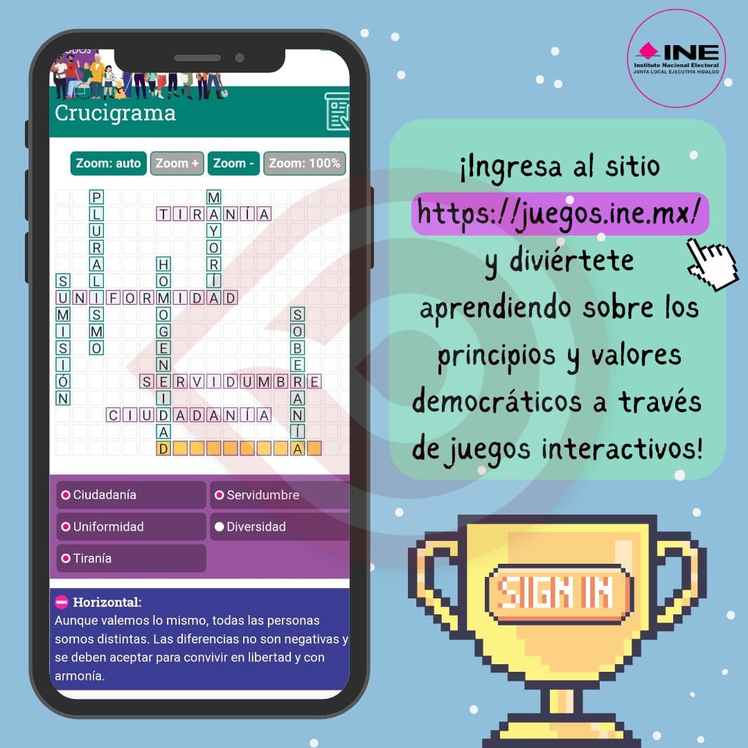 Más adelante, señaló que, con los Juegos Interactivos se pretende que los alumnos del nivel básico junto con sus familias aprendan todo lo relacionado con los valores y principios de la democracia; parte de lo que puede observarse en la página del INE son Crucigramas, Serpientes y Escaleras, Juegos de Memoria, Lotería, el Gato Cívico, Ruta de la Democracia.